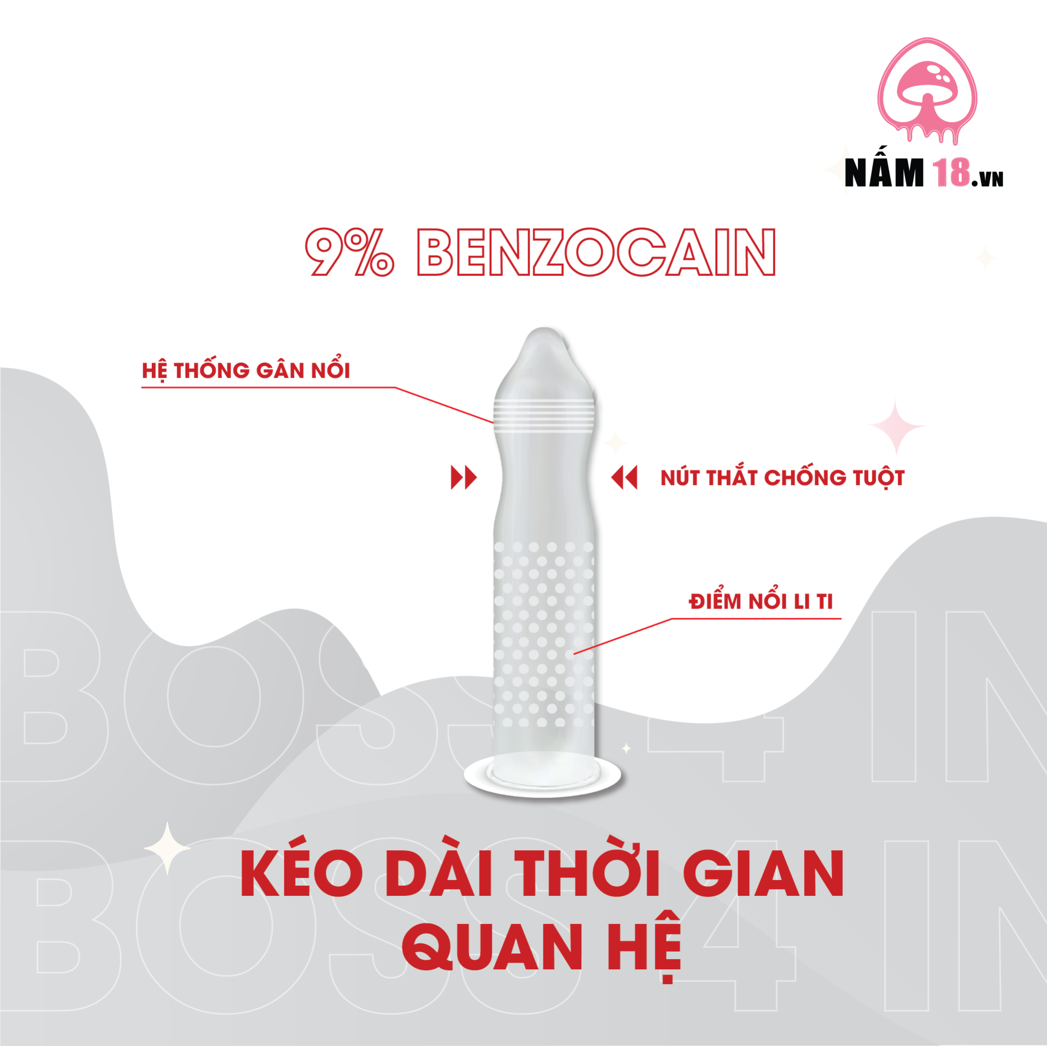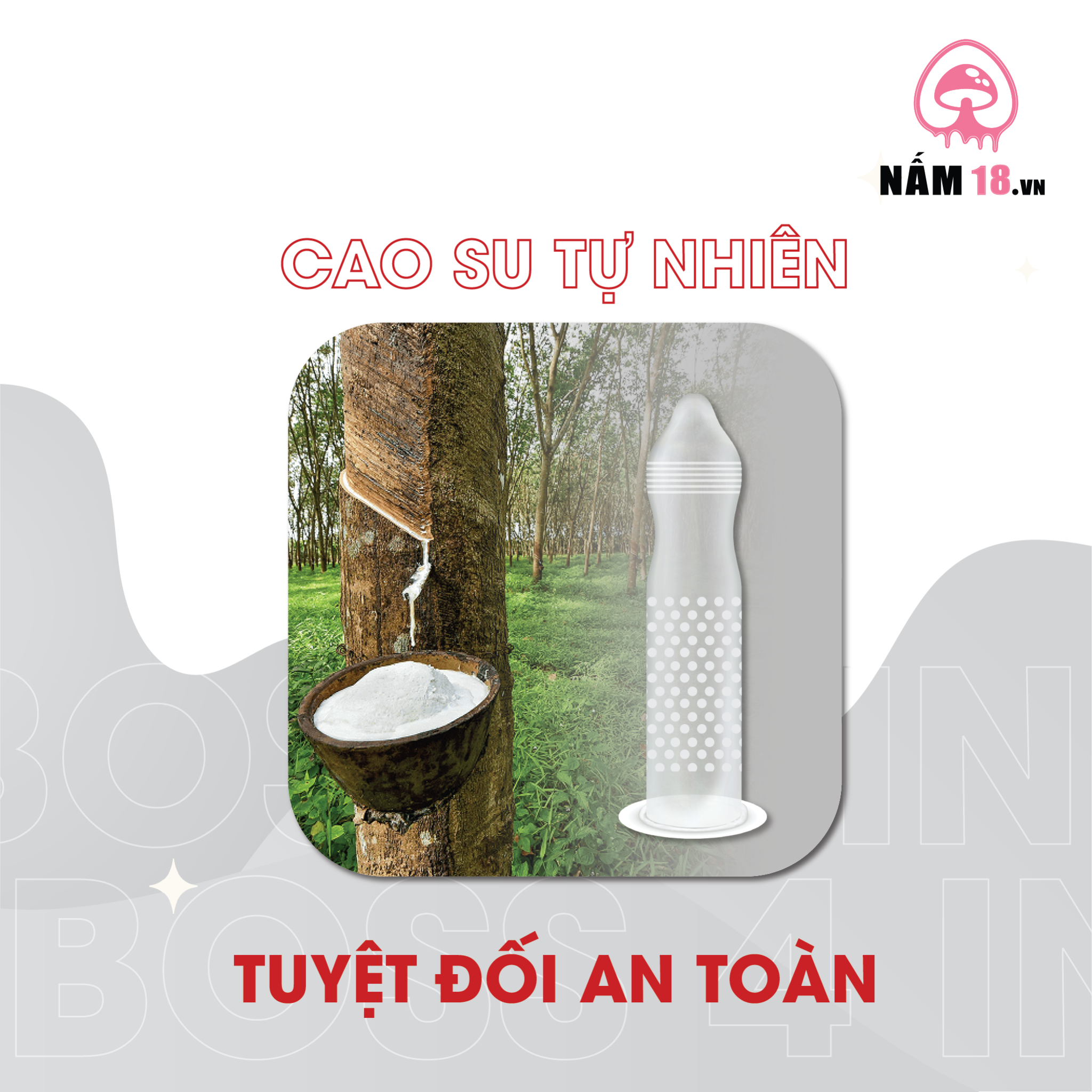 - Thông tin: Bao cao su Boss 4in1 là dòng bao cao su có xuất xứ từ Malaysia. Sản phẩm chứa 7% hoạt chất Benzocaine giúp kéo dài thời gian quan hệ và chống xuất tinh sớm. Khi quan hệ, các điểm nổi trên thân bao sẽ cọ xát vào bên trong âm đạo khiến nàng kích thích tột đỉnh. Đây là sản phẩm thuộc phân khúc tầm trung, nhưng vẫn đáp ứng đầy đủ các tính năng không khác gì một chiếc bao cao su cao cấp, phù hợp với túi tiền của người tiêu dùng.