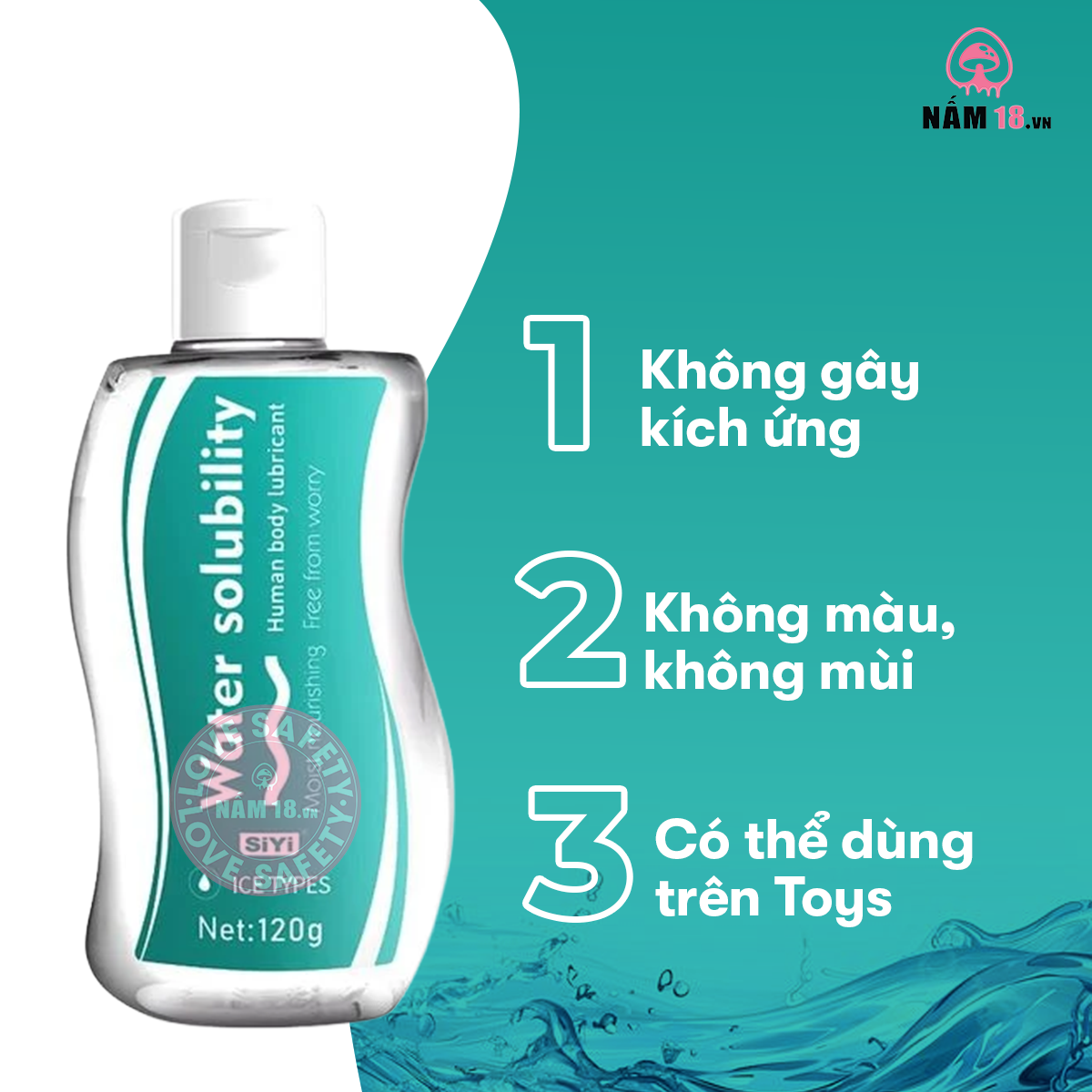 Gốc nước 100%: An toàn tuyệt đối khi dùng chung với tất cả các loại đồ chơi tình dục (kể cả loại làm bằng silicone cao cấp) và bao cao su latex.
